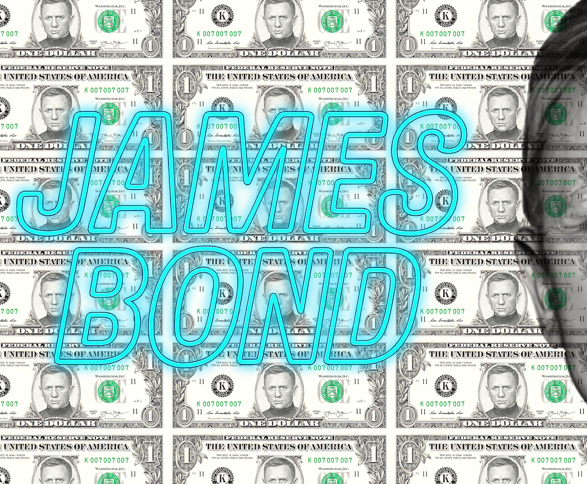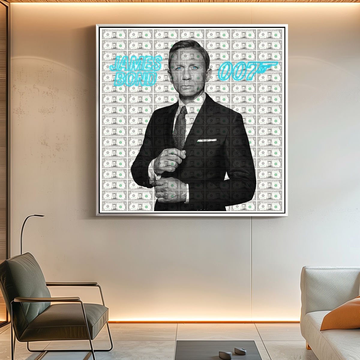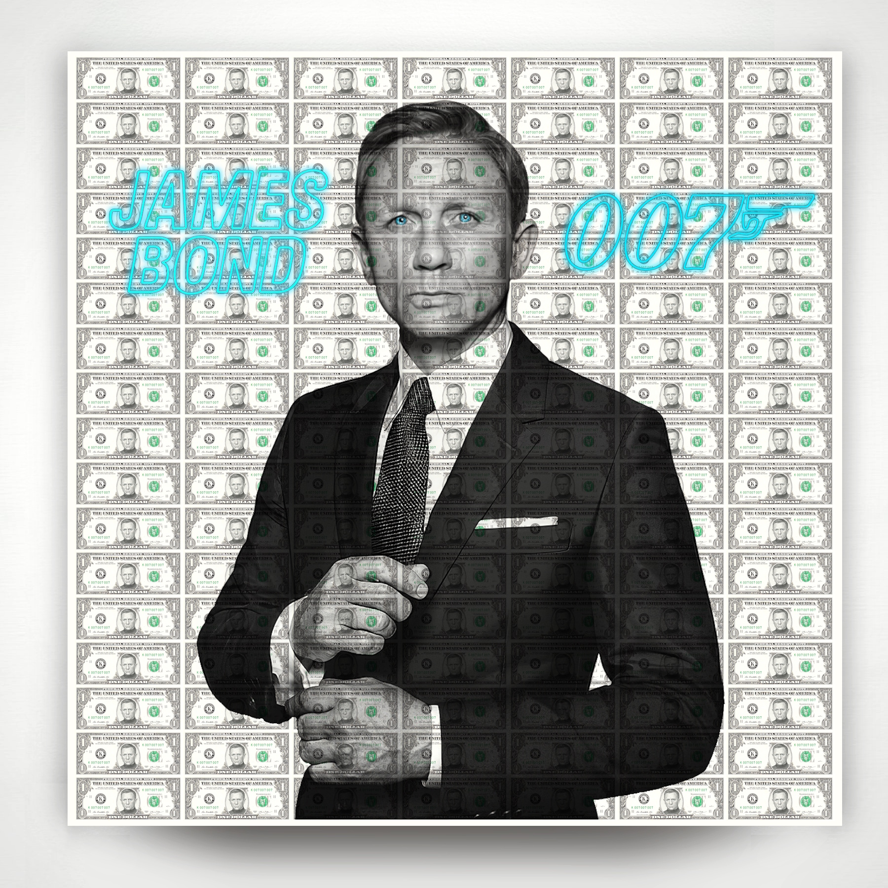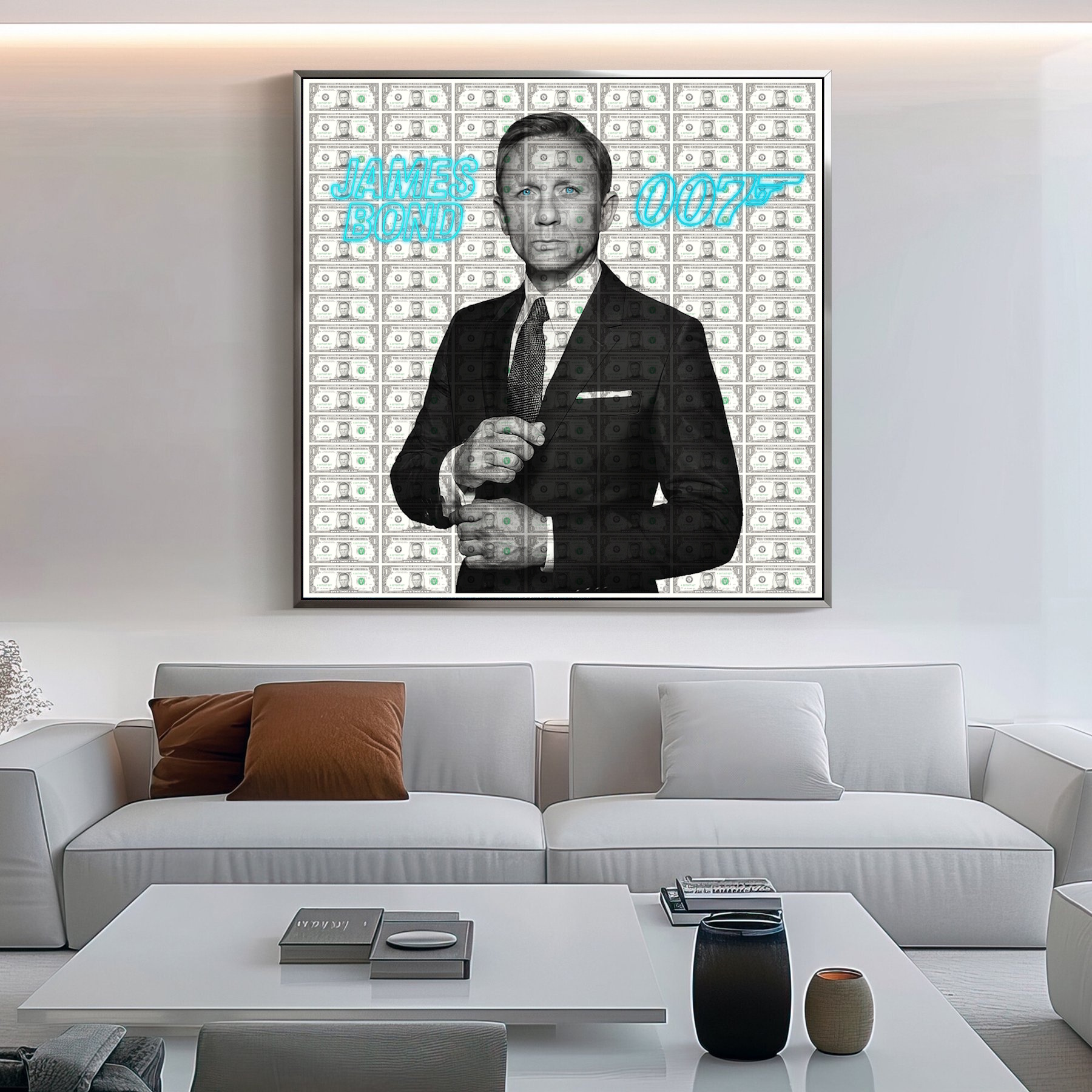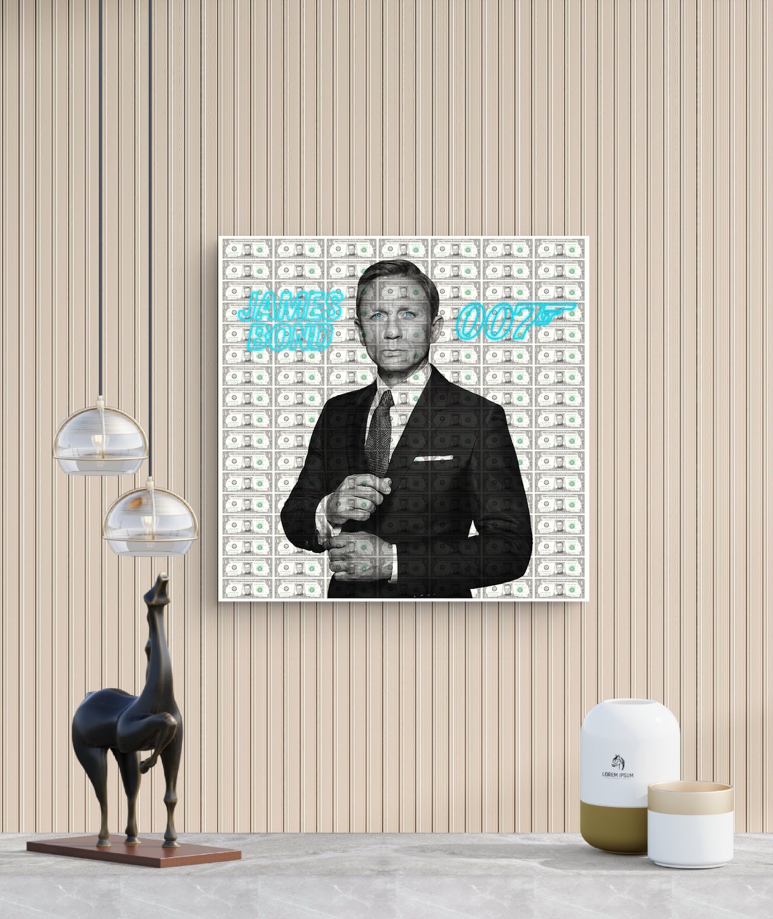 Stylish pop art portrait of Daniel Craig as James Bond on 007 notes.